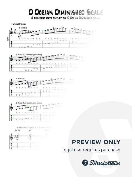 This sheet shows guitarists 4 ways to play the D Dorian Diminished Scale:
