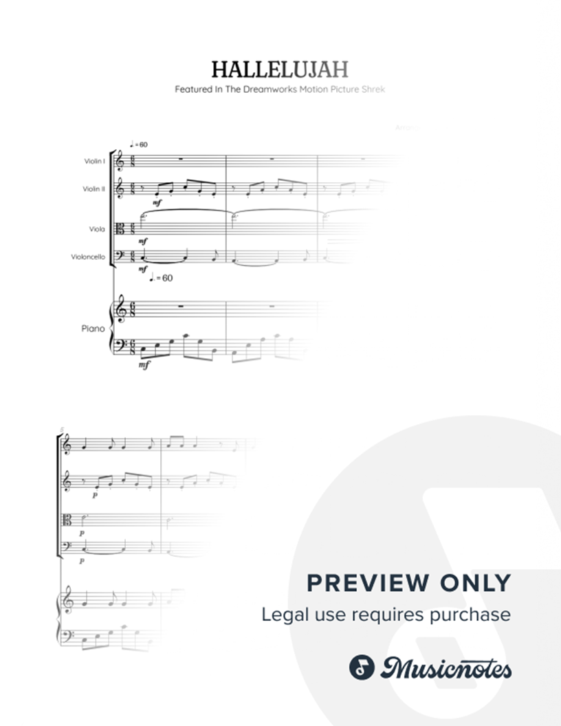 Cohen • Hallelujah from Shrek Soundtrack • string quartet sheet music w/ piano accompaniment |