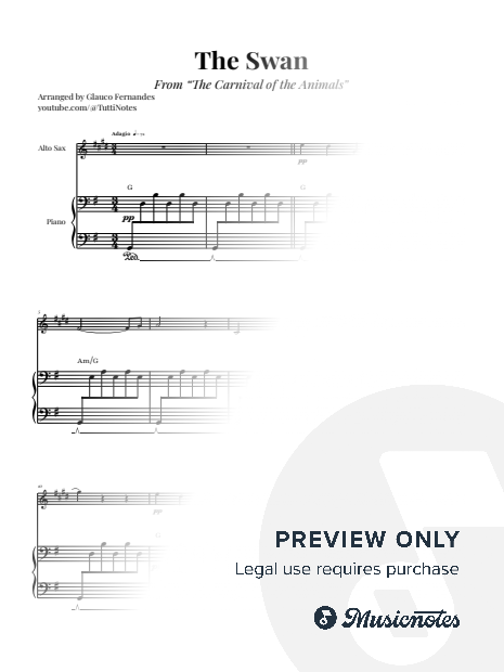 Sheet music for The Swan by Camille Saint-Saëns arranged for Alto Saxophone and Piano. Professional layout. Clear notation. Perfect for performances. Purchase now!