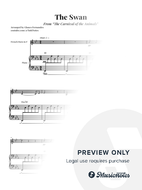 Sheet music for The Swan by Camille Saint-Saëns arranged for French Horn and Piano. Professional layout. Clear notation. Perfect for performances. Purchase now!