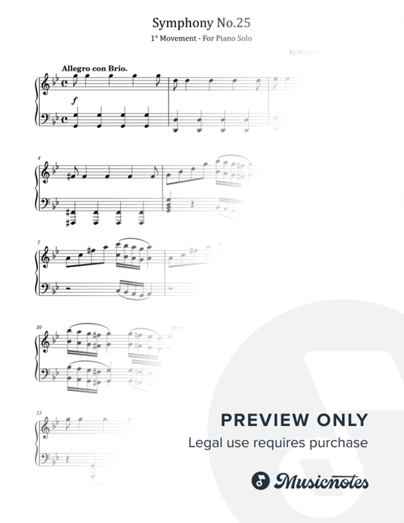 Mozart, Symphony No.25 K.183/173dB, 1st Movement, for Piano Solo |