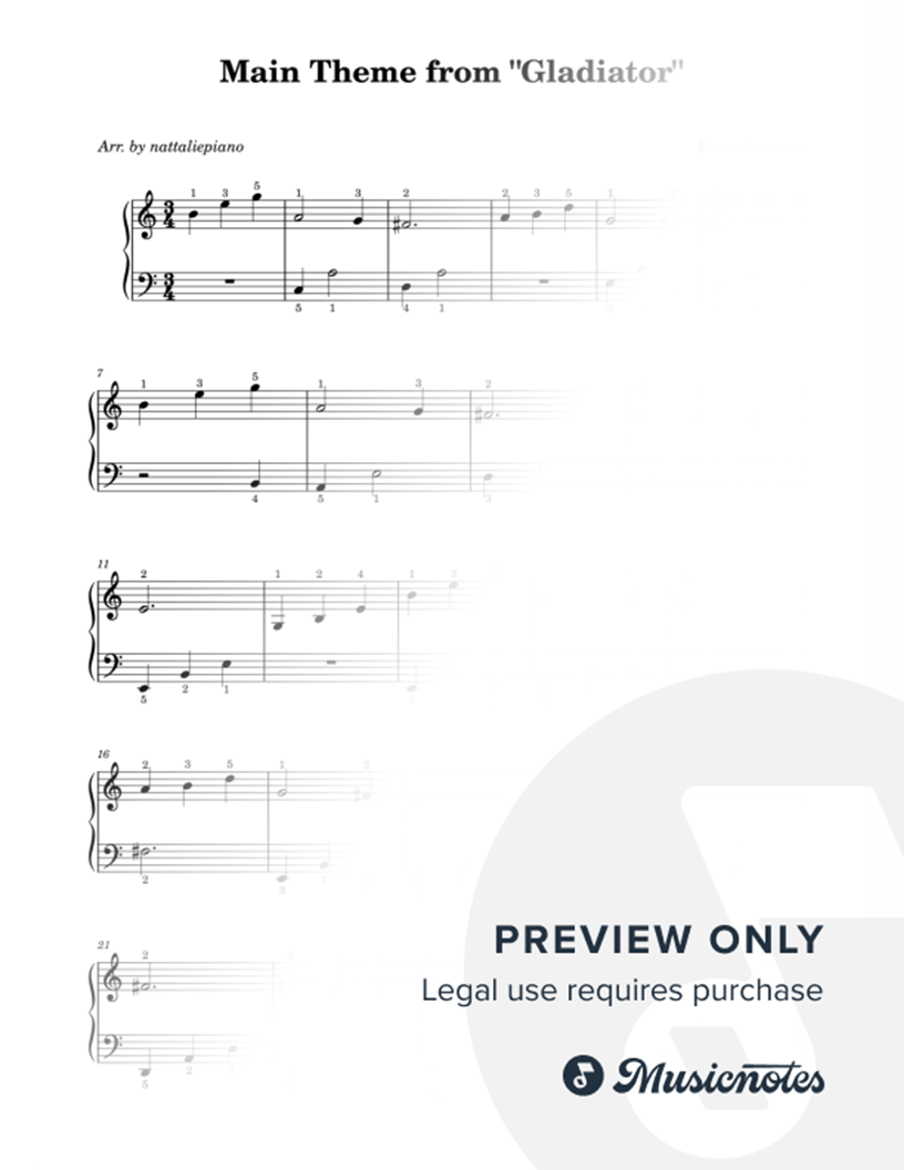 Main Theme (Gladiator OST) Beginner by Hans Zimmer and Lisa Gerrard arranged for easy piano. This simplified sheet music features clear notation and accessible fingering, perfect for students and early-level players. Ideal for those searching for movie soundtrack piano music, beginner arrangements,