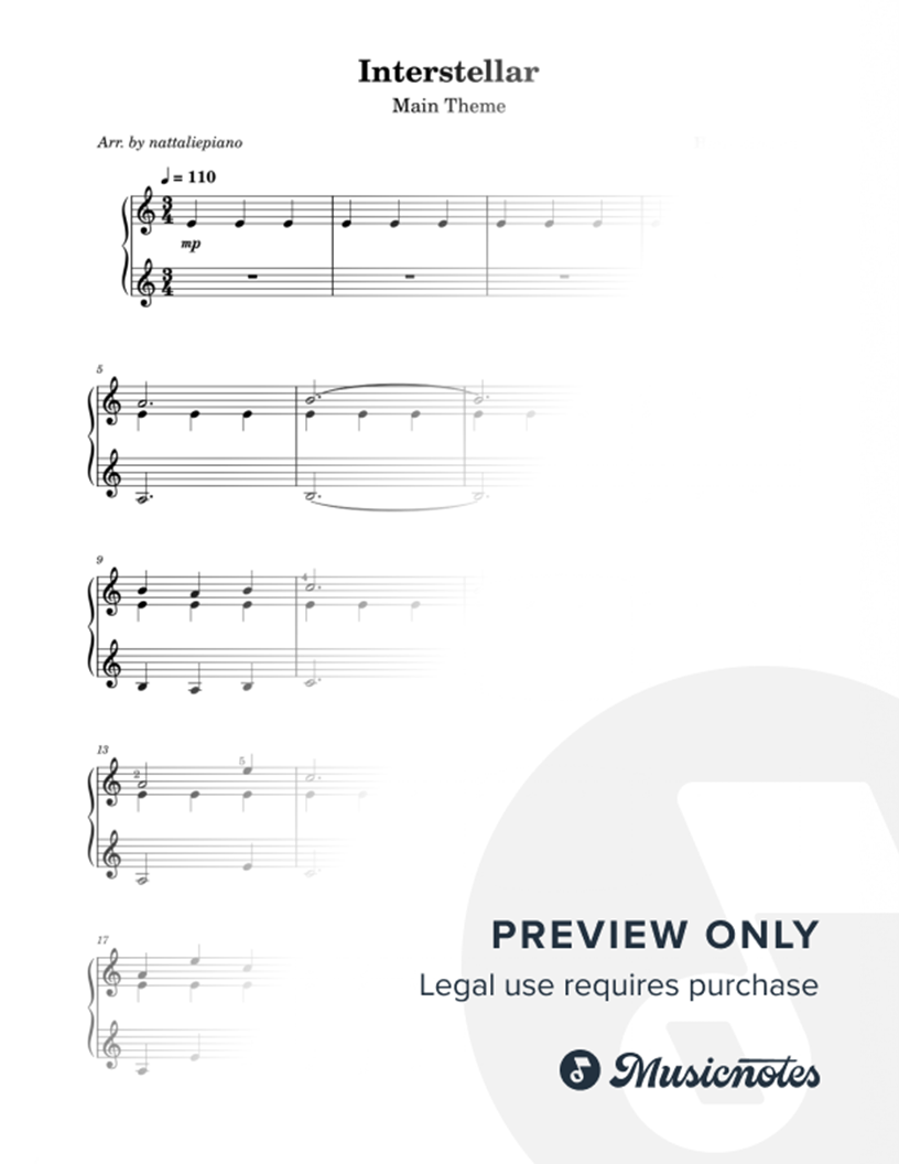 Main Theme from the Interstellar soundtrack by Hans Zimmer arranged for medium-level piano. This atmospheric cinematic score features expressive melodies, rich harmonies, and dynamic phrasing, perfect for fans of film music, epic soundtracks, and emotional piano arrangements.