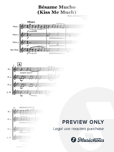 'Bésame Mucho' is a love song which reflects its Mexican origin in its Latin-inspired rhythm and melody. Arranged for flute quartet. Like this? Why not check out my website for more arrangements: www.khuelinmusic.co.uk