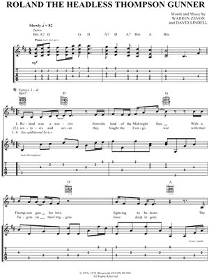 Lyrics begin: "Roland was a warrior from the Land of the Midnight Sun, with a Thomp son gun for hire, fighting to be done."