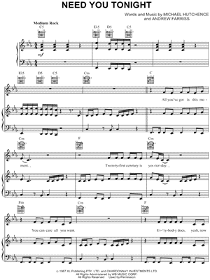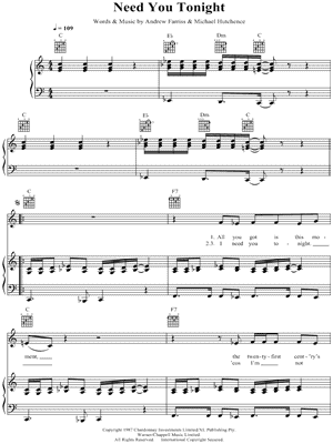 Browse our 3 arrangements of "Need You Tonight." Sheet music is available for Piano, Voice, Guitar and 6 others with 3 scorings and 1 notation in 8 genres. Find your perfect arrangement and access a variety of transpositions so you can print and play instantly, anywhere.