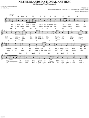 Lyrics begin: "William of Nassau, scion of Dutch and ancient line, I dedicate undying faith to this land of mine."