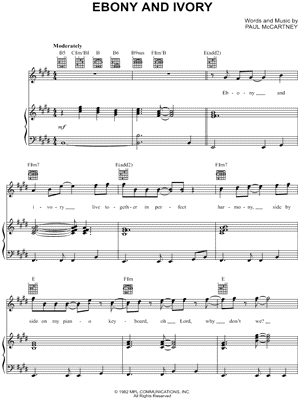 Browse our 22 arrangements of "Ebony and Ivory." Sheet music is available for Piano, Voice, Guitar and 13 others with 8 scorings and 3 notations in 8 genres. Find your perfect arrangement and access a variety of transpositions so you can print and play instantly, anywhere.