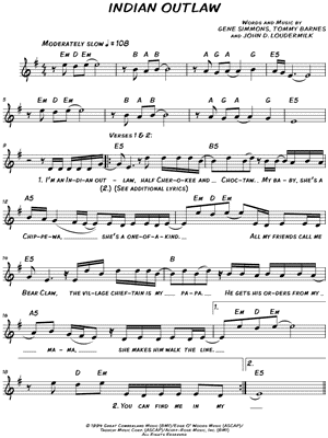 Lyrics begin: "I'm an Indian outlaw, half Cherokee and Choctaw."