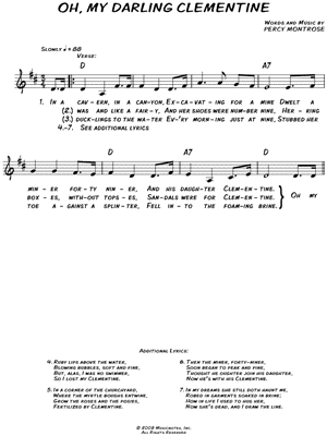 Lyrics begin: "In a cavem down by a canyon, excavating for a mine, there lived a nuner from North Carolina and his daughter, chubby Clementine."