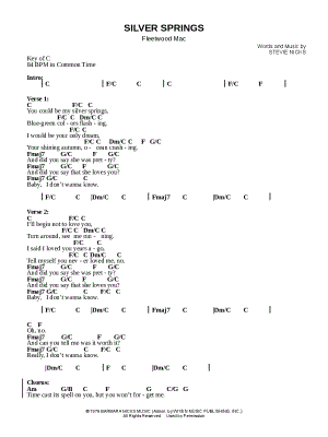 Browse our 7 arrangements of "Silver Springs." Sheet music is available for Piano, Voice, Guitar and 2 others with 7 scorings and 1 notation in 3 genres. Find your perfect arrangement and access a variety of transpositions so you can print and play instantly, anywhere.