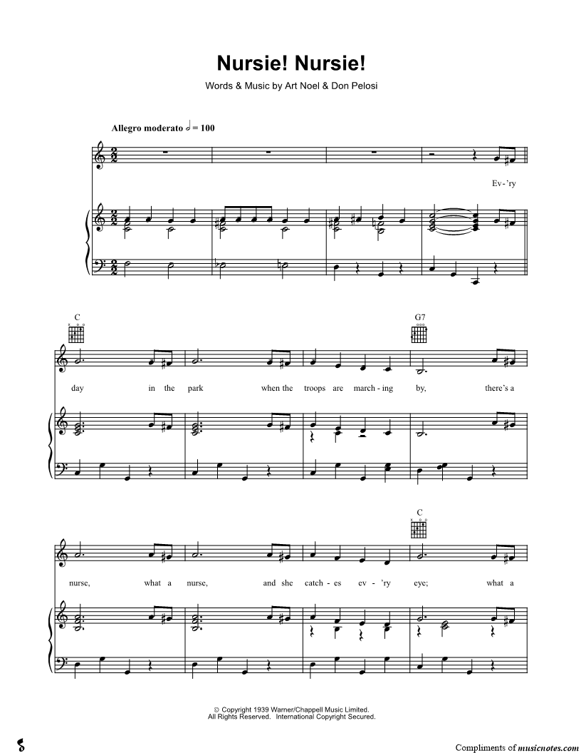 Ev'ry day in the park when the troops are marching by, there's a nurse, what a nurse, and she catches ev'ry eye; what a style, what a smile, can you wonder why they fall, from the Colonel to the Private, you'll hear the army call. |