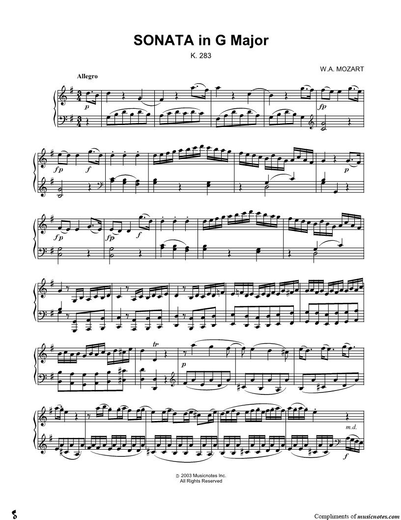 1. Sonata No. 5 in G Major, K. 283: I. Allegro (click here to preview and play this piece) Composer: Scored For:Instrumental Solo Instrument:Piano Number of pages:5 Click here to purchase this piece separately for $5.99 |