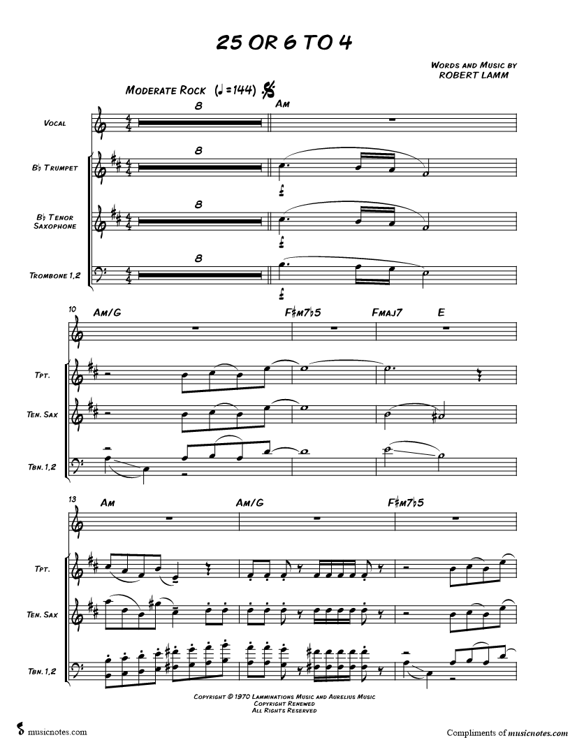 1. 25 or 6 to 4 (with Horn Parts) (click here to preview and play this piece) Performer: Composer: Lyricist: Scored For:Instrument/Vocal/Chords and Transcription Instruments:Voice, range: A4-C6, Tenor Saxophone, range: F#4-C#6, Trombone 1, range: E2-B4, Trombone 2 and Trumpet, range: E4-A5 Number of pages:6 Click here to purchase this piece separately for $4.99 |