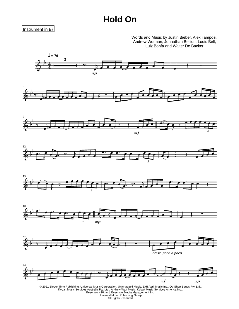 1. Hold On - Bb Instrument (click here to preview and play this piece) Performer: Composers: Lyricists: Scored For:Instrumental Solo and Instrumental Part Instruments:Bb Instrument, range: D4-F5, Trumpet, Soprano Saxophone, Tenor Saxophone and Clarinet Number of pages:2 Click here to purchase this piece separately for $4.99 |