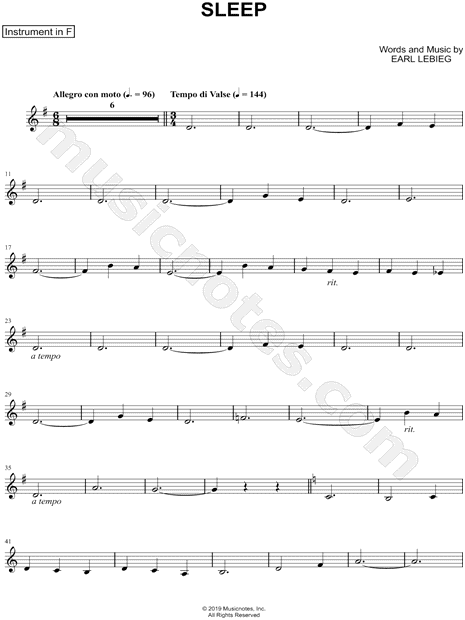 1. Sleep - F Instrument (click here to preview and play this piece) Composer: Lyricist: Scored For:Instrumental Solo and Instrumental Part Instruments:F Instrument, range: A3-C5 and French Horn Number of pages:3 Click here to purchase this piece separately for $4.99 |