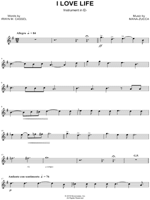 1. I Love Life - Eb Instrument (click here to preview and play this piece) Performers: Composer: Lyricist: Scored For:Instrumental Part and Instrumental Solo Instruments:Eb Instrument, range: G4-B5, Alto Saxophone and Baritone Saxophone Number of pages:2 Click here to purchase this piece separately for $4.99 |