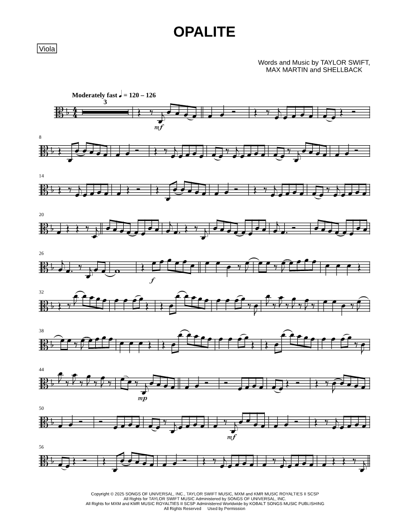 1. Opalite - Viola (click here to preview and play this piece) Performer: Composers: Lyricists: Scored For:Instrumental Solo Instrument:Viola, range: C3-C5 Number of pages:2 Click here to purchase this piece separately for $3.99 |
