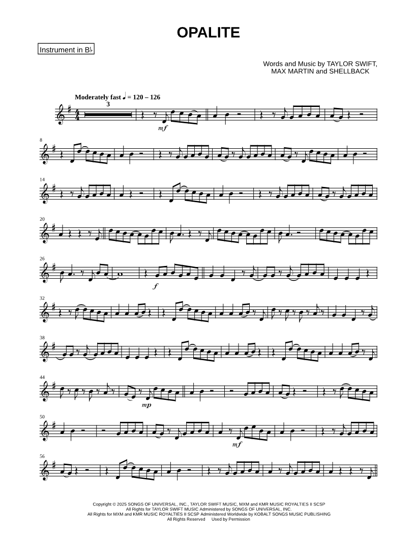 1. Opalite - Bb Instrument (click here to preview and play this piece) Performer: Composers: Lyricists: Scored For:Instrumental Solo Instruments:Bb Instrument, Trumpet, Tenor Saxophone, Soprano Saxophone and Clarinet Number of pages:2 Click here to purchase this piece separately for $3.99 |
