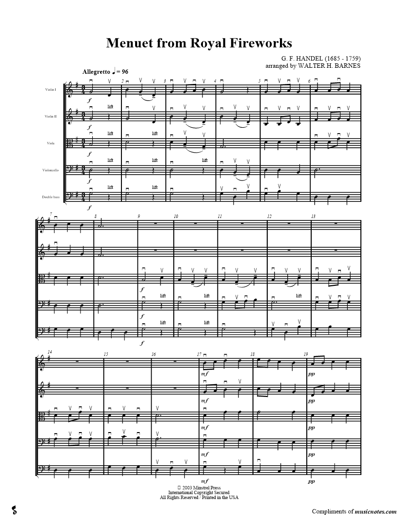 1. Menuet From Royal Fireworks (click here to preview and play this piece) Composer: Scored For:String Ensemble Instruments:Cello, range: G2-D4, Viola, range: G3-G4, Violin 2, range: B3-C5, Violin 1, range: D4-E5 and Double Bass, range: G2-B3 Number of pages:2 Click here to purchase this piece separately for $5.79 |