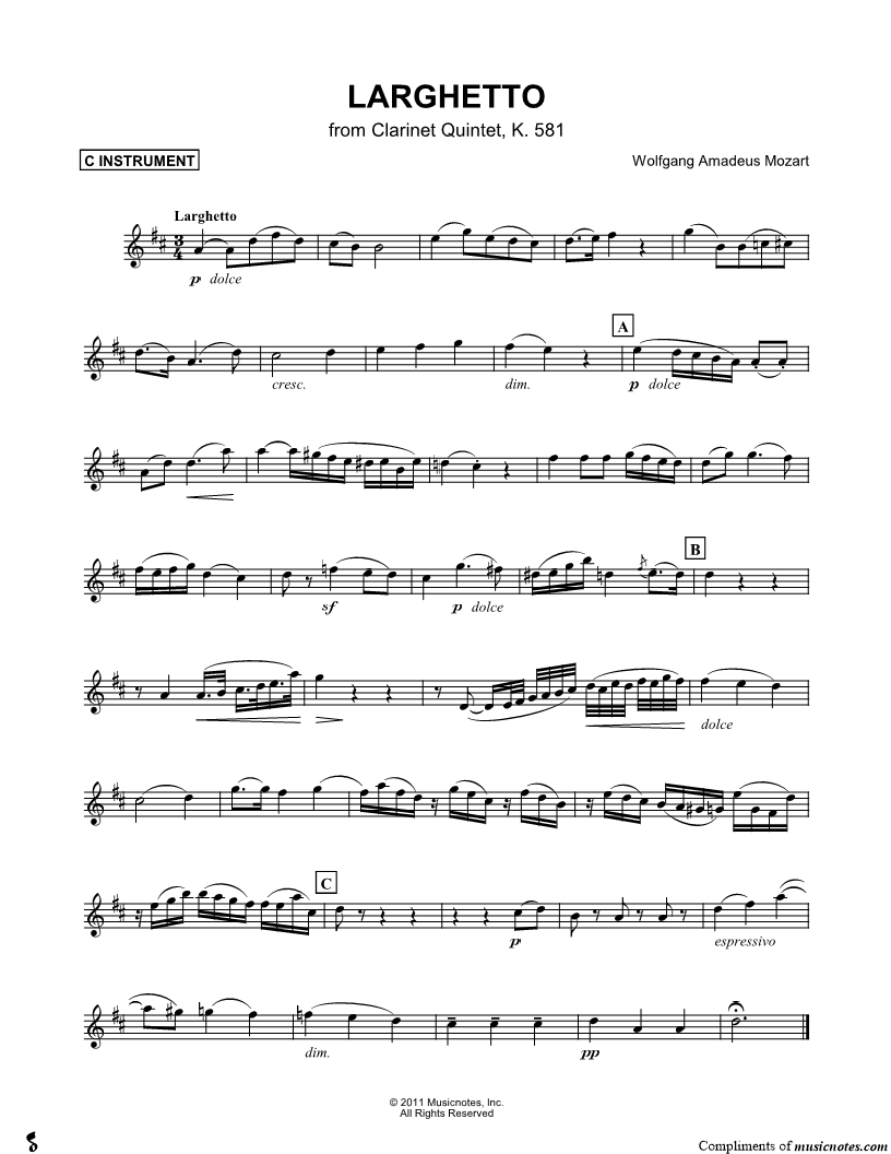 1. Larghetto from Clarinet Quintet, K. 581 - C Instrument (click here to preview and play this piece) Composer: Scored For:Instrumental Solo Instruments:C Instrument, range: D4-B5, Violin, Oboe, Flute and Recorder Number of pages:1 Click here to purchase this piece separately for $4.99 |