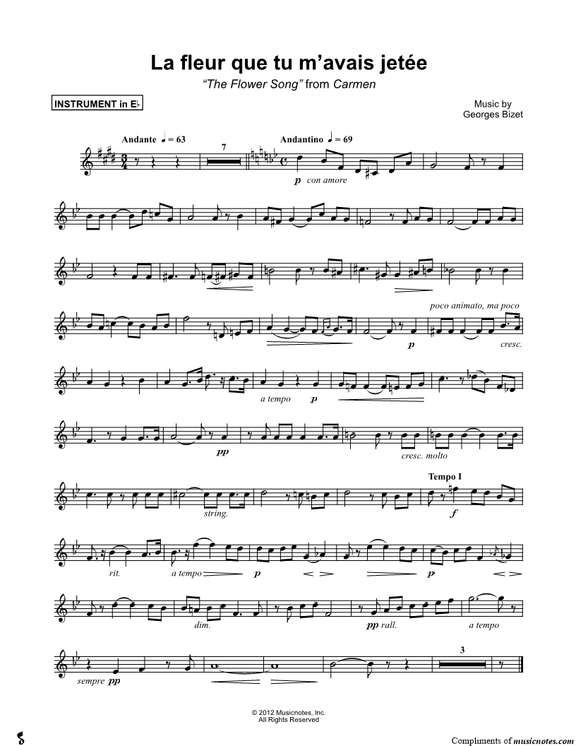 1. The Flower Song - Eb Instrument (click here to preview and play this piece) Composer: Scored For:Instrumental Solo Instruments:Eb Instrument, Alto Saxophone and Baritone Saxophone Number of pages:1 Click here to purchase this piece separately for $4.99 |