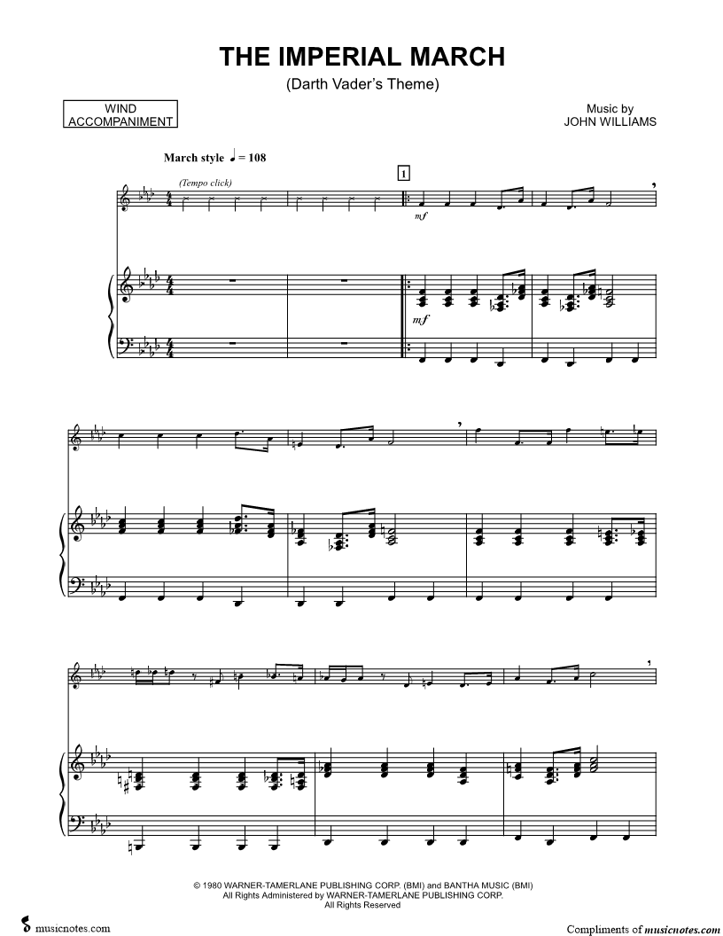 1. The Imperial March - Piano Accompaniment (click here to preview and play this piece) Composer: Scored For:Solo & Accompaniment and Instrumental Part Instruments:Piano Accompaniment, C Instrument, range: Bb3-F5, Violin, Oboe, Flute and Recorder Number of pages:3 Click here to purchase this piece separately for $5.99 |