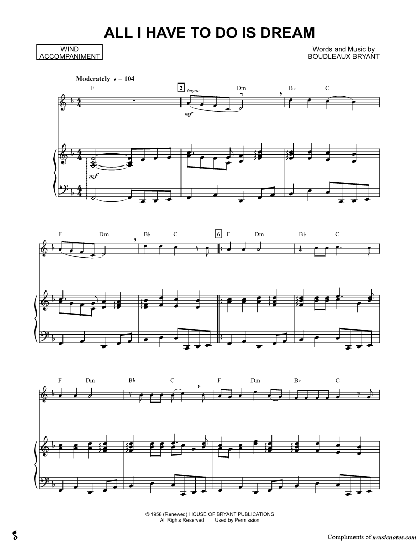 1. All I Have to Do Is Dream - Wind Accompaniment (click here to preview and play this piece) Performer: Composer: Lyricist: Scored For:Solo & Accompaniment and Instrumental Part Instruments:Piano Accompaniment, C Instrument, range: C4-E5, Violin, Oboe, Flute and Recorder Number of pages:3 Click here to purchase this piece separately for $5.99 |