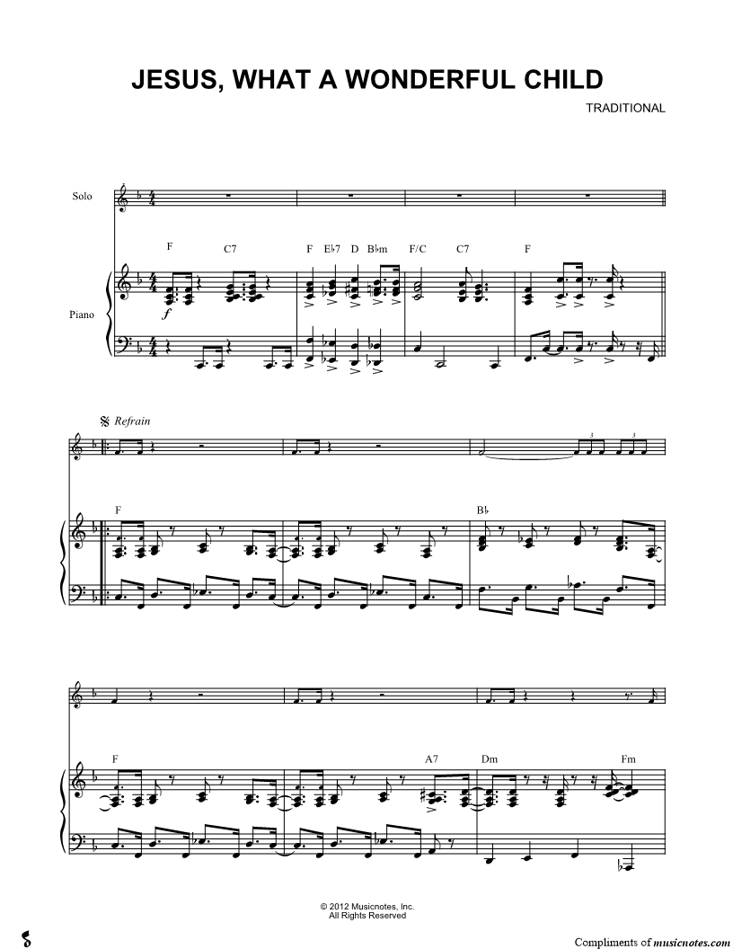 1. Jesus, What a Wonderful Child - Piano Accompaniment (click here to preview and play this piece) Composer: Lyricist: Scored For:Solo & Accompaniment and Instrumental Part Instruments:Piano Accompaniment, C Instrument, range: C4-C5, Violin, Oboe, Flute and Recorder Number of pages:3 Click here to purchase this piece separately for $4.99 |