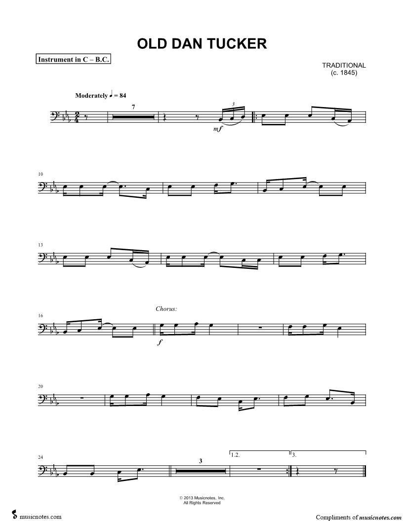 1. Old Dan Tucker - Bass Clef Instrument (click here to preview and play this piece) Composer: Scored For:Instrumental Solo and Instrumental Part Instruments:Bass Clef Instrument, range: Ab2-Ab3, Cello, Double Bass, Trombone, Bassoon and Baritone Horn Number of pages:1 Click here to purchase this piece separately for $4.99 |