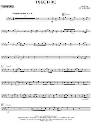 1. I See Fire - Trombone (click here to preview and play this piece) Performer: Composer: Lyricist: Scored For:Instrumental Part and Instrumental Solo Instrument:Trombone, range: Bb2-Bb3 Number of pages:2 Click here to purchase this piece separately for $4.99 |