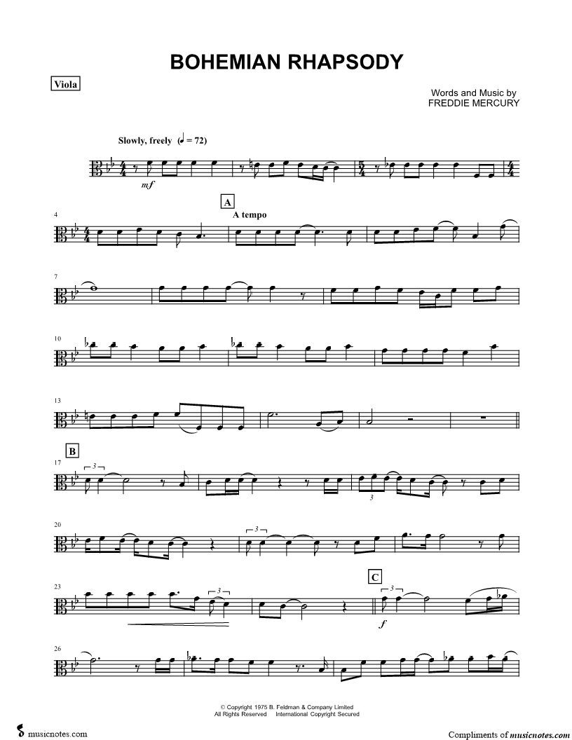1. Bohemian Rhapsody - Viola (click here to preview and play this piece) Performer: Composer: Lyricist: Scored For:Instrumental Part and Instrumental Solo Instrument:Viola, range: F3-G5 Number of pages:4 Click here to purchase this piece separately for $4.99 |