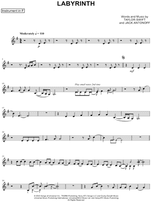1. Labyrinth - F Instrument (click here to preview and play this piece) Performer: Composers: Lyricists: Scored For:Instrumental Solo and Instrumental Part Instruments:F Instrument, range: G3-C5 and French Horn Number of pages:2 Click here to purchase this piece separately for $4.99 |