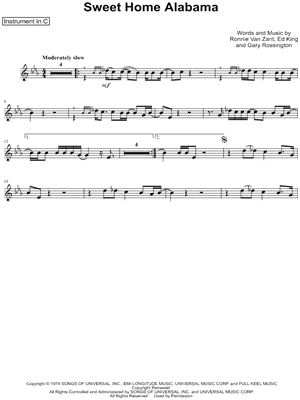 1. Sweet Home Alabama - C Instrument (click here to preview and play this piece) Performer: Composers: Lyricists: Scored For:Instrumental Solo and Instrumental Part Instruments:C Instrument, range: Eb4-D5, Flute, Oboe, Violin and Recorder Number of pages:1 Click here to purchase this piece separately for $4.99 |