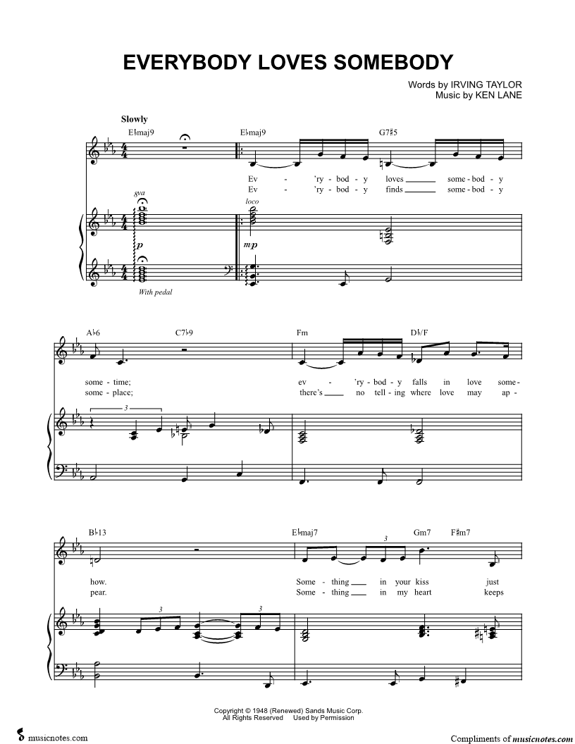 Ev'rybody loves somebody sometime; ev'rybody falls in love somehow. |