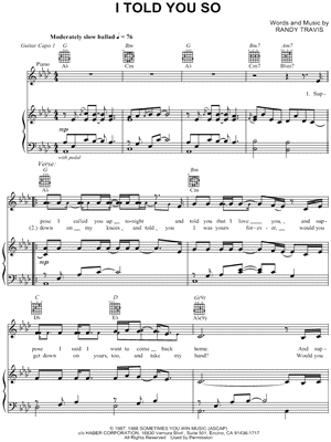 Browse our 2 arrangements of "I Told You So." Sheet music is available for Piano, Voice, Guitar and 1 others with 2 scorings and 1 notation in 3 genres. Find your perfect arrangement and access a variety of transpositions so you can print and play instantly, anywhere.