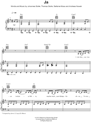 Browse our 1 arrangement of "Ja." Sheet music is available for Piano, Voice, Guitar with 2 scorings in 5 genres. Find your perfect arrangement and access a variety of transpositions so you can print and play instantly, anywhere.