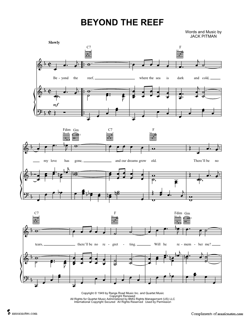 Beyond the reef, where the sea is dark and cold, my love has gone, and our dreams grow old. |