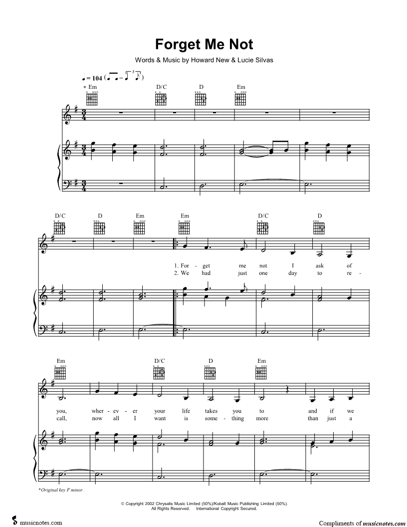 Forget me not I ask of you, wherever your life takes you to and if we never meet again think of me ev'ry now and then. |