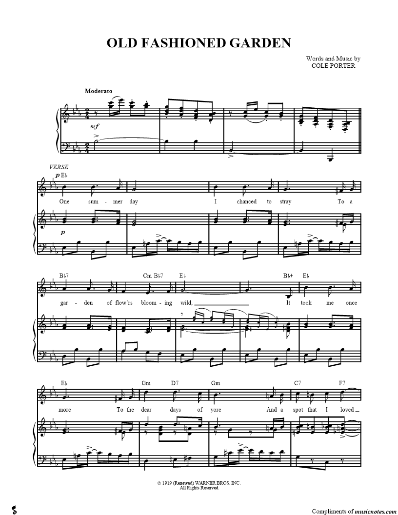 One summer day I chanced to stray To a garden of flow'rs blooming wild, It took me once more To the dear days of yore And a spot that I loved as a child; There were the phlox, tall hollyhocks, Violets perfuming the air |