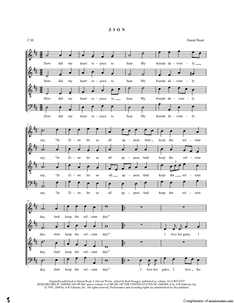 How did my heart rejoice to hear My friends devoutly say, "In Zion let us all appear, And keep the solemn day!" |