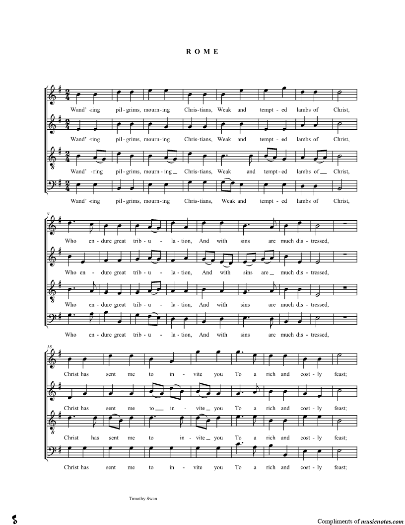Wand'ring pilgrims, mourning Christians, Weak and tempted lambs of Christ, Who endure great tribulation, And with sins are much distressed, Christ has sent me to invite you To a rich and costly feast; |