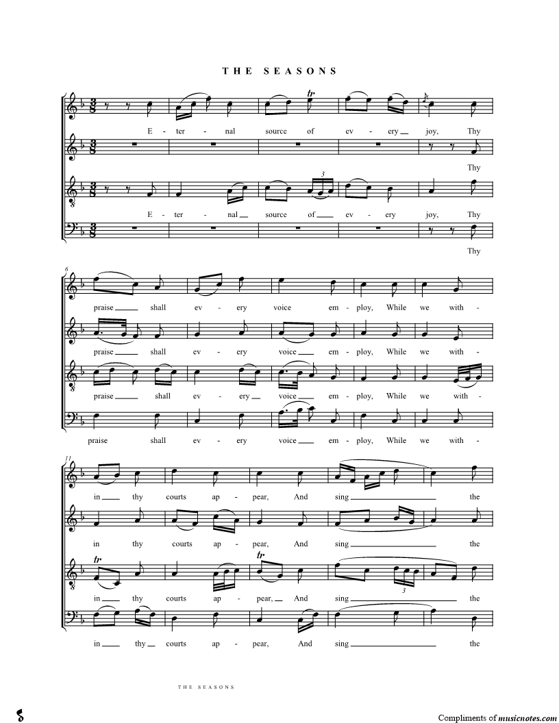 Eternal source of every joy, Thy praise shall every voice employ, While we within thy courts appear, And sing the bounties of the year. |
