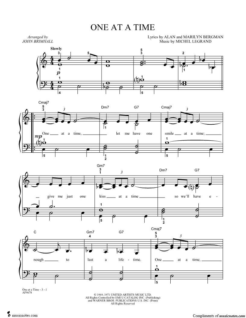 One at a time, let me have one smile at a time; give me just one kiss at a time so we'll have enough to last a lifetime. |