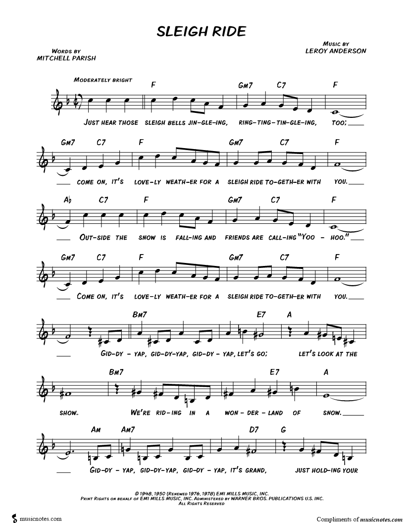 Just hear those sleigh bells jingleing, ringtingtingleing, too; come on, it's lovely weather for a sleigh ride together with you. |