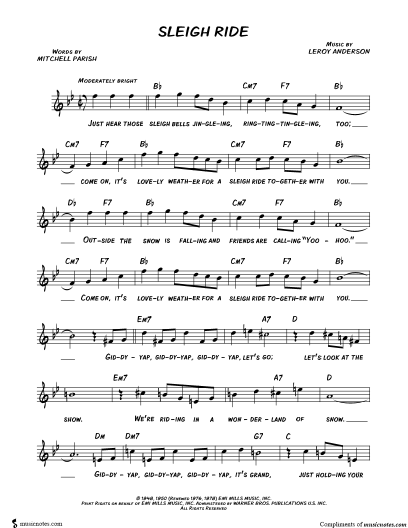 Just hear those sleigh bells jingleing, ringtingtingleing, too; come on, it's lovely weather for a sleigh ride together with you. |