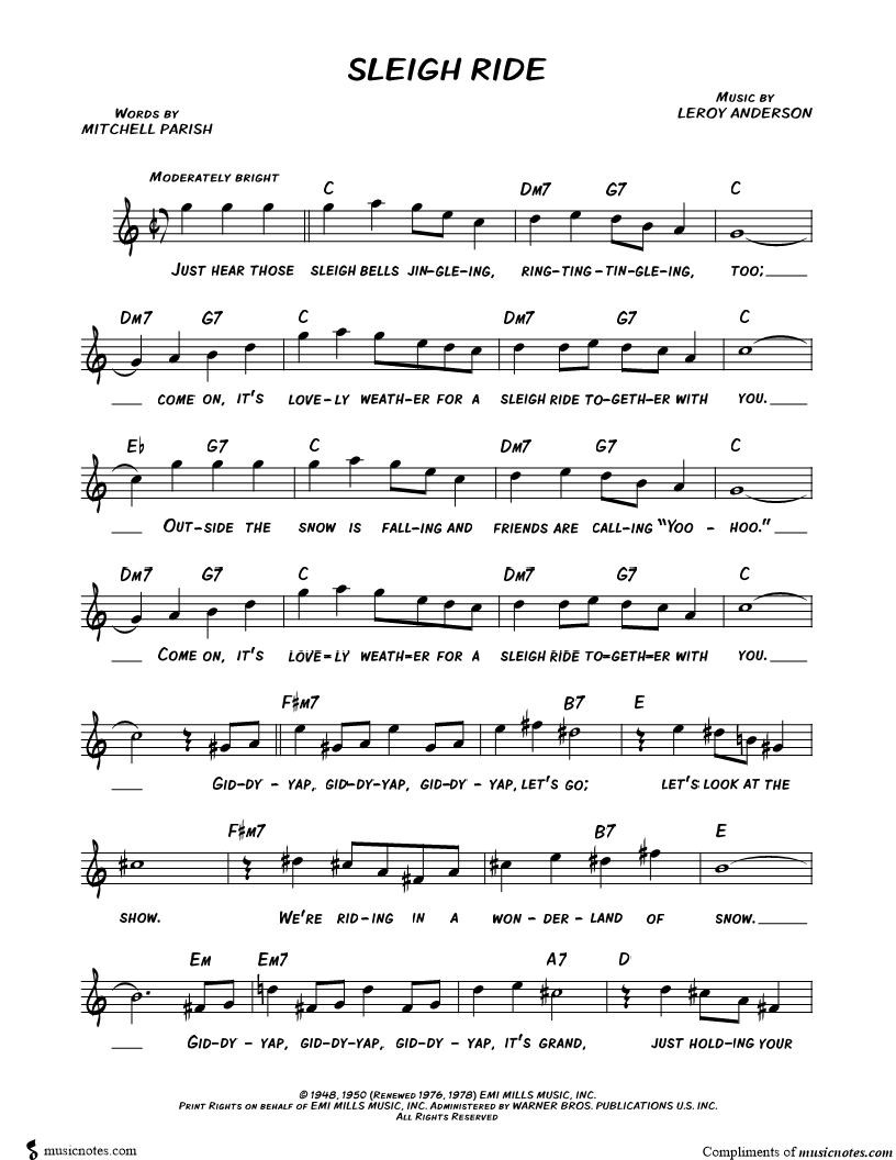 Just hear those sleigh bells jingleing, ringtingtingleing, too; come on, it's lovely weather for a sleigh ride together with you. |