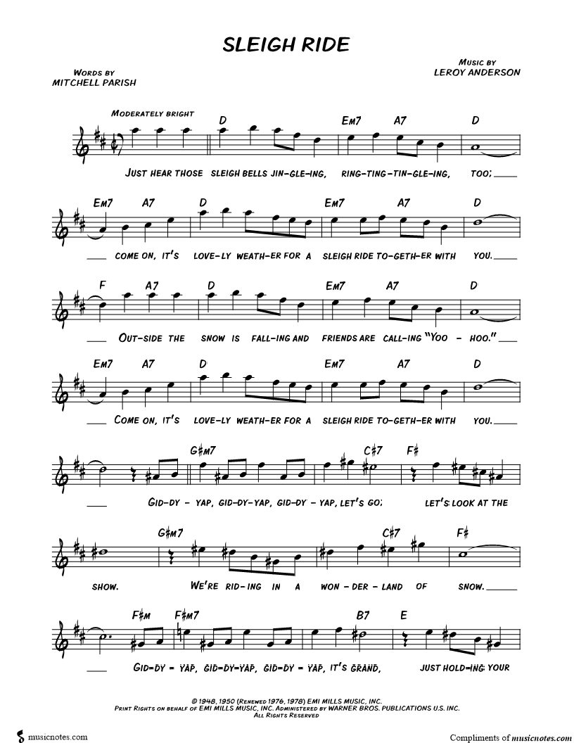 Just hear those sleigh bells jingleing, ringtingtingleing, too; come on, it's lovely weather for a sleigh ride together with you. |