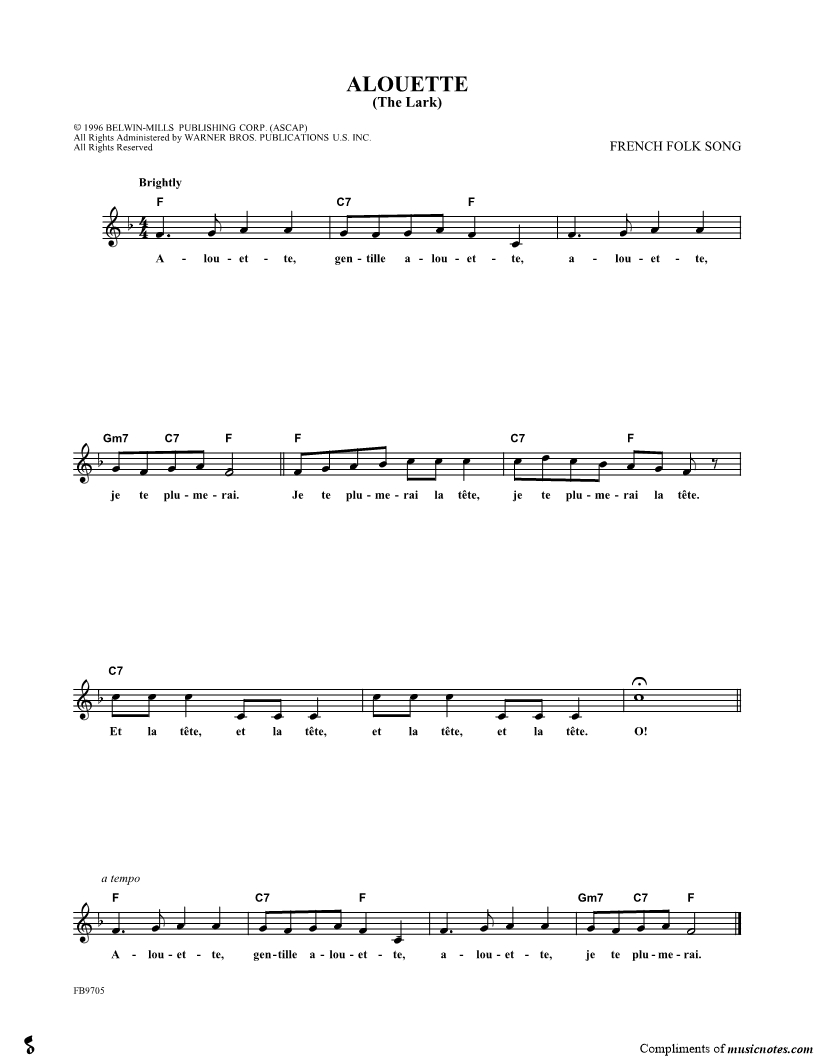 Alouette, gentille alouette, alouette, je te plumerai. |