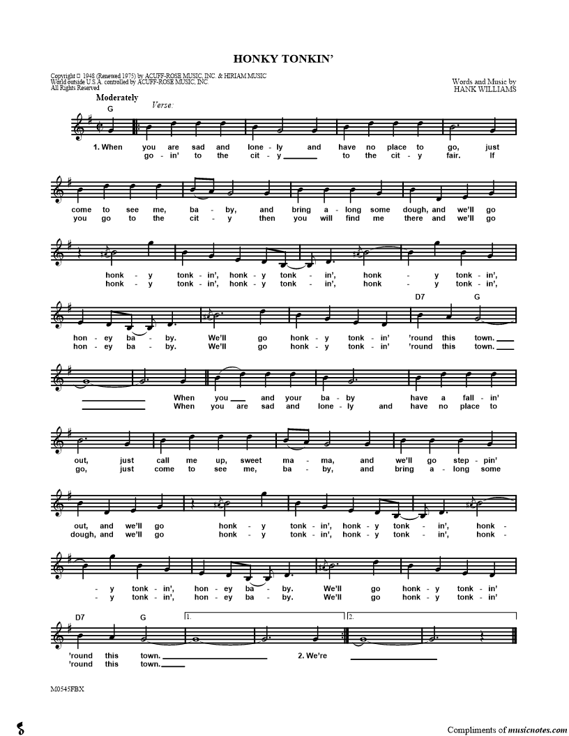 When you are sad and lonely and have no place to go, just come to see me, baby, and bring along some dough, and we'll go honky tonkin', honky tonkin', honky tonkin', honey baby. |